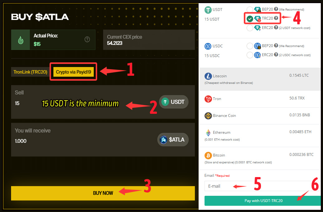 STEP 2: Log in to the “Dashboard,” select “Crypto via Payid19” to pay with USDT or other cryptocurrencies, and purchase $ATLA, 15 USDT is the minimum ( If you have a TronLink wallet, you can log in and pay directly through your wallet ).